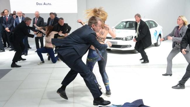 Στις εικόνες που μετέδωσε το γερμανικό τηλεοπτικό δίκτυο συνεχούς ενημέρωσης NTV, φαίνοτναι δύο από τις γυμνόστηθες, που είχαν γραμμένο στο σώμα τους με μαύρη μπογιά το σύνθημα που φώναξαν, να τίθενται με δυσκολία υπό έλεγχο από την αστυνομία.
