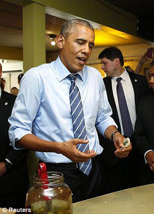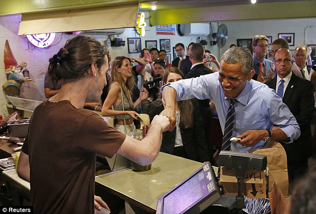 Ο πρόεδρος Ομπάμα, λοιπόν, μπήκε στο μαγαζί και… αγνόησε την τεράστια ουρά, γεγονός που εξόργισε τους πελάτες του μαγαζιού. Έτσι, πήγε κατευθείαν στο ταμείο και προσπέρασε τους πάντες! Για να δικαιολογηθεί, επικαλέστηκε τον φόρτο εργασίας του και τον λίγο χρόνο που έχει στη διάθεσή του.