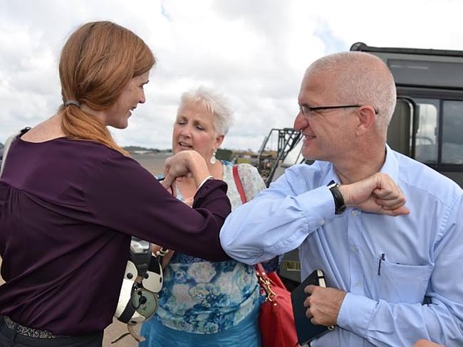 Η πρέσβειρα των Ηνωμένων Εθνών Samantha Power παρούσιασε στο κοινό την «χειραψία του Έμπολα», ενώ χαιρετούσε τον Peter Graaff της Παγκόσμιας Οργάνωσης Υγείας, στη Λιβερία.