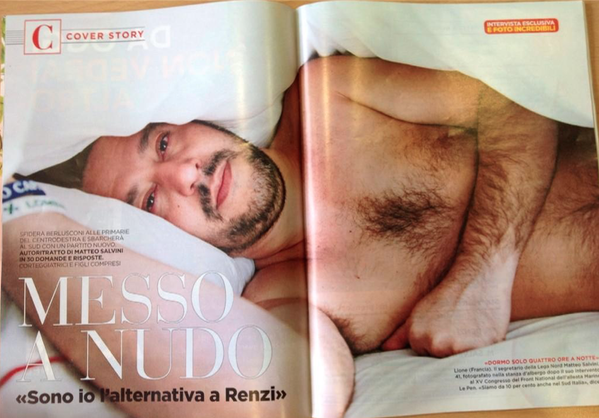 O Ματέο Σαλβίνι, ο 41χρονος ηγέτης της Λέγκας του Βορρά, του ξενοφοβικού κόμματος που τάσσεται κατά του ευρώ, επέλεξε να απαθανατιστεί ημίγυμνος, μέσα σε μία κρεβατοκάμαρα στο πλαίσιο μίας φωτογράφησης για ένα εβδομαδιαίο περιοδικό, για να υπογραμμίσει την αίσθηση ανανέωσης που φέρνει στην πολιτική σκηνή της Ιταλίας.