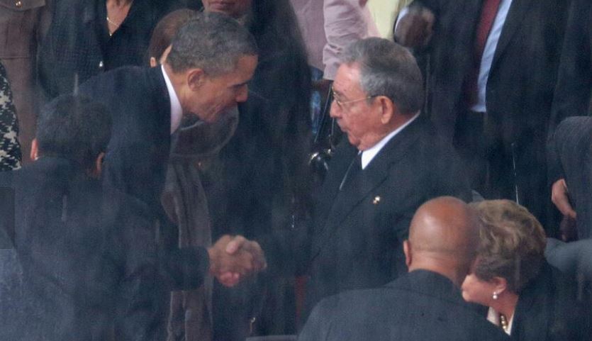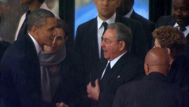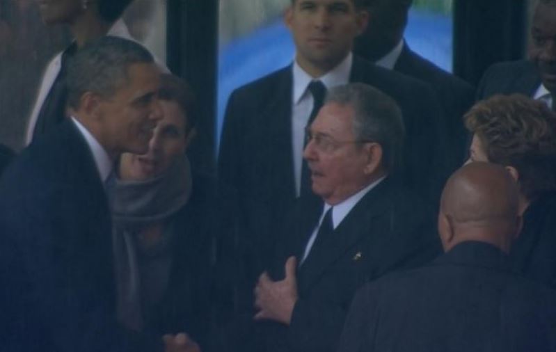 Ο Αμερικανός πρόεδρος πριν ανέβει στο βήμα για να μιλήσει στο πλήθος που έχει συγκεντρωθεί στο στάδιο του Σοβέτο για να αποχαιρετήσει τον Μαντέλα, πλησίασε τον Ραούλ Κάστρο και το χαιρέτισε.
