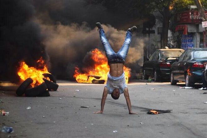 Η βία γύρω του μαίνεται. Το Κάιρο για μία ακόμα ημέρα φλέγεται. Κι εκείνος αποφασίζει να κάνει κάτι εντελώς τρελό. Σταματάει να τρέχει να κρυφτεί και κάνει κατακόρυφο. Στέκεται με τα χέρια ανάποδα για αρκετή ώρα, εντελώς απροστάτευτος στα αντιμαχόμενα πυρά των υποστηρικτών της Μουσουλμανικής Αδελφότητας και του στρατού. Ατρόμητος ή τρελός; Η φωτογραφία του πάντως κάνει τον γύρο του διαδικτύου και μοιάζει με ένα διαφορετικό τρόπο καταγγελίας του παραλογισμού που κυριαρχεί στην Αίγυπτο.