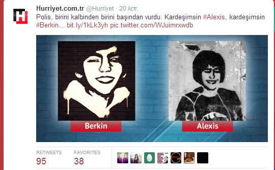 «Η αστυνομία πυροβόλησε στην καρδιά. Είσαι ο αδελφός μου Αλέξη, είσαι ο αδελφός μου» γράφει η λεζάντα στη κοινή φωτογραφία graffiti των δύο παιδιών που δημοσιεύει σήμερα η Hurriyet. Η ασπρόμαυρη φωτογραφία απεικονίζει τον Μπερκίν Ελβάν και τον Αλέξη Γρηγορόπουλο.