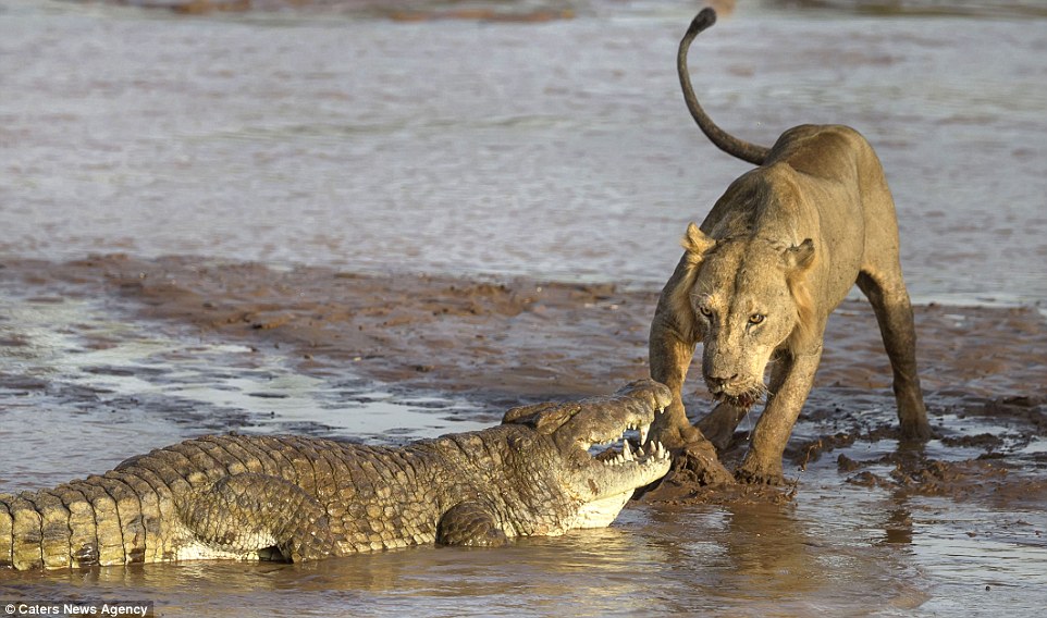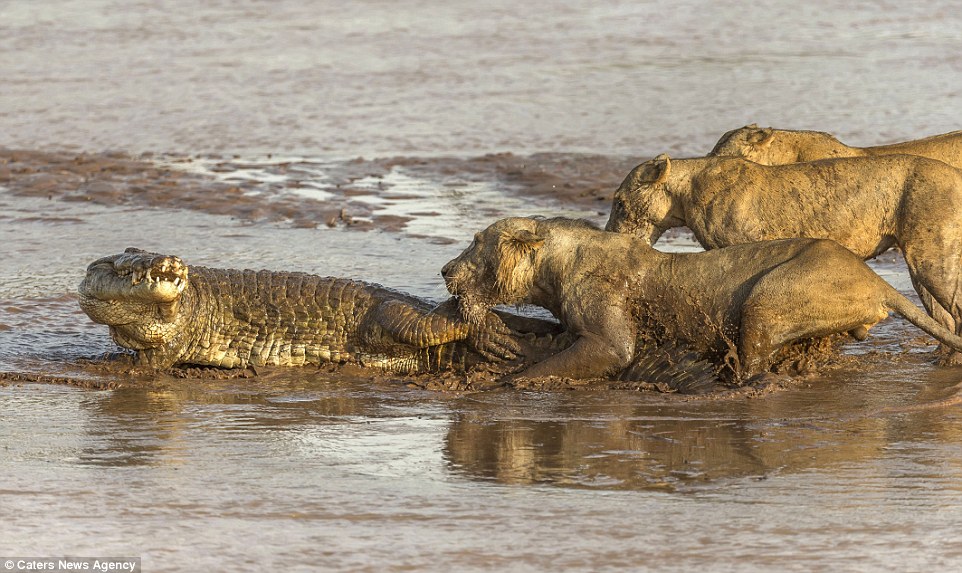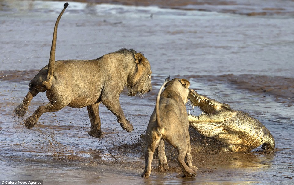 Ένα από τα λιοντάρια, αντιλήφθηκε ότι ο κροκόδειλος προσπάθησε να δαγκώσει μέρος από το ζώο. Τότε το λιοντάρι επιτέθηκε στο ερπετό και δάγκωσε τα πόδια του.