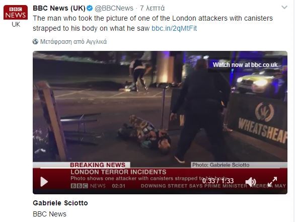 Τo BBC έδωσε πριν από λίγο στη δημοσιότητα τη φωτογραφία ενός άνδρα που είναι πεσμένος στο έδαφος και σύμφωνα με πληροφορίες αποτελεί έναν από τους δράστες του αιματηρού διπλού χτυπήματος στο Λονδίνο.