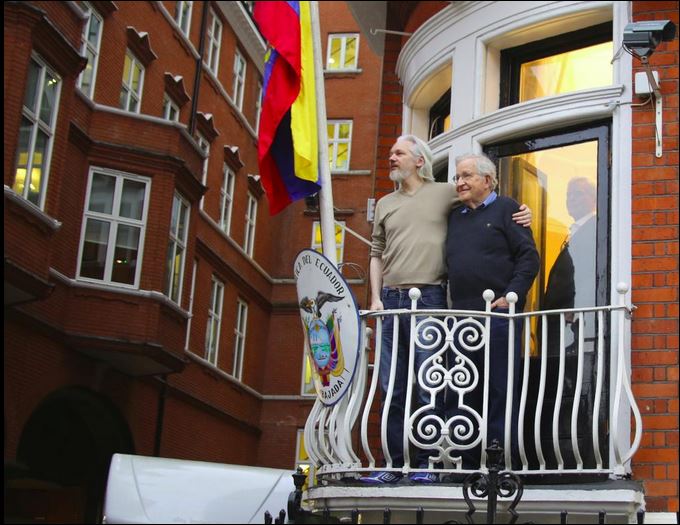Ο ιδρυτής του ιστότοπου WikiLeaks Τζούλιαν Ασάνζ παρακολουθεί μαζί με τον Αμερικανό καθηγητή Νόαμ Τσόμσκι την επιχείρηση της βρετανικής αστυνομίας στην πρεσβεία του Εκουαδόρ στο Λονδίνο. Ο Ασάνζ βρίσκεται εδώ και πάνω από δύο χρόνια κλεισμένος στην πρεσβεία για να αποφύγει την έκδοσή του στη Σουηδία ως υπόπτου για σεξουαλικά αδικήματα.