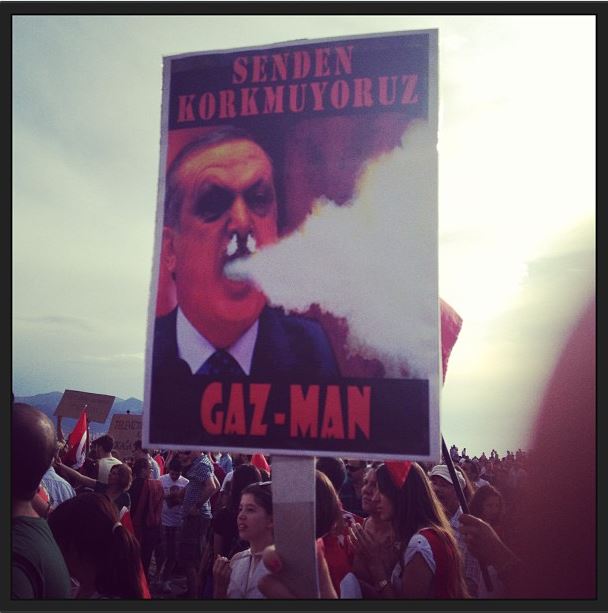Στο πλακάτ κάποιου ευφάνταστου πολίτη ο Ερντογάν χαρακτηρίζεται ως “gaz man”, λόγω των δακρυγόνων, που χρησιμοποίησε η αστυνομία την Παρασκευή.