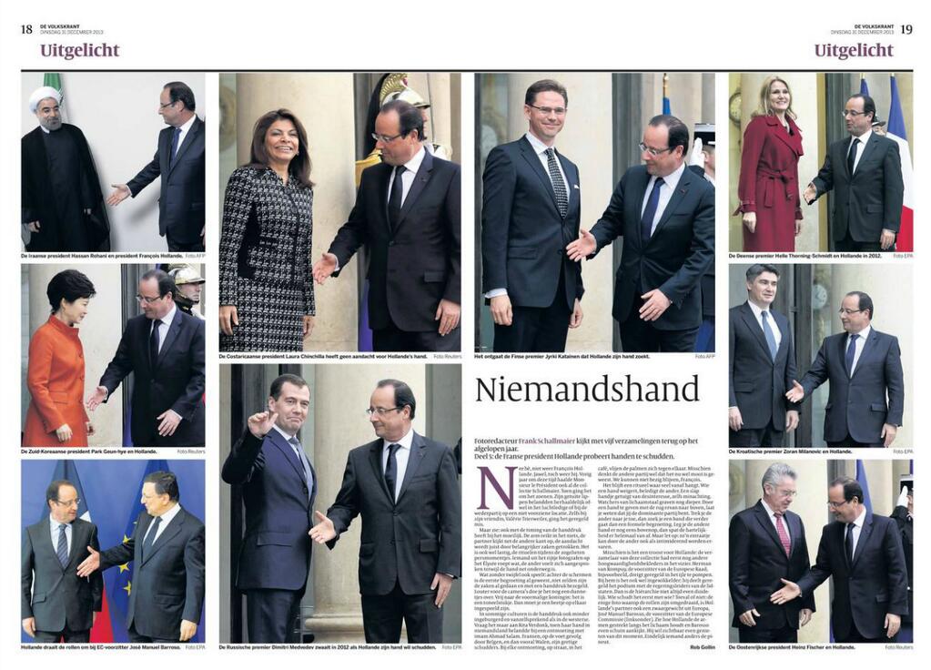 «Ο Φρανσουά Ολάντ είναι ο λιγότερο δημοφιλής Γάλλος πρόεδρος και κανείς δεν θέλει να του σφίξει το χέρι. Μόνο ο πρόεδρος της Ευρωπαϊκής Επιτροπής, Ζοζέ Μανουέλ Μπαρόζο, του έδωσε πρώτος το χέρι», γράφουν τα Διεθνή Μέσα Ενημέρωσης, σχολιάζοντας τη φωτογραφία.