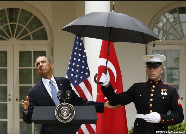 Κάθε ομιλία του Προέδρου των Ηνωμένων Πολιτειών, Μπαράκ Ομπάμπα, στον Λευκό Οίκο, έχει πάντα ενδιαφέρον. Ωστόσο όπως φαίνεται και στην συγκεκριμένη φωτογραφία την παράσταση πριν την έναρξη της ομιλίας του έκλεψε η γκριμάτσα του Αμερικανού Προέδρου, καθώς δίπλα του στεκόταν ένας πεζοναύτης από την Προεδρική Φρουρά, να κρατάει μία ομπρέλα, χωρίς όμως να βρέχει.