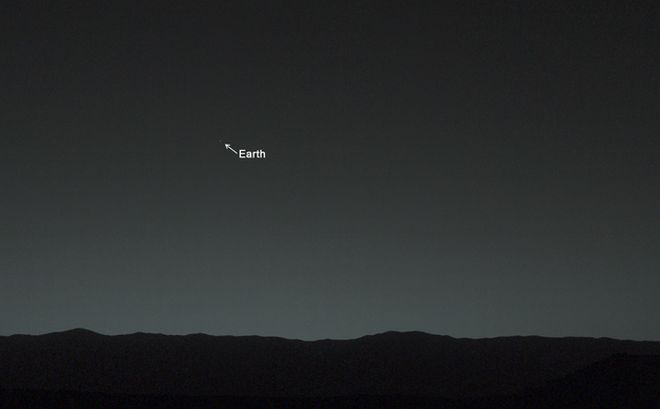 To Curiosity απαθανάτισε τη Γη από την επιφάνεια του Άρη, η οποία φαίνεται σαν μια μικρή φωτεινή κουκίδα στο σκοτεινό ουρανό. Σύμφωνα με τη Nasa στη συγκεκριμένη φωτογραφία που λήφθηκε 80 λεπτά μετά τη δύση του ηλίου, η Γη είναι το πιο λαμπερό αστέρι στον μοναχικό νυχτερινό ουρανό του Άρη.