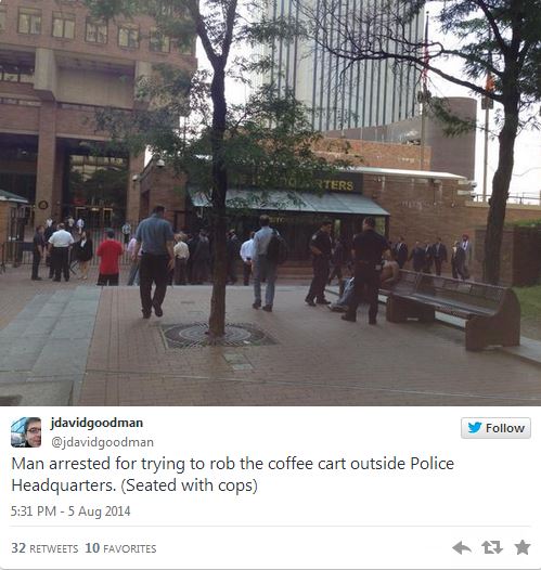 Και ο επίδοξος κλέφτης δεν μπορεί να τα βάζει με την ατυχία του, δεδομένου ότι προσπάθησε να κλέψει ένα μαγαζί που βρίσκεται ακριβώς δίπλα στα κεντρικά γραφεία της αστυνομίας του Μανχάταν και στο οποίο συχνάζουν καθημερινά αστυνομικοί!
