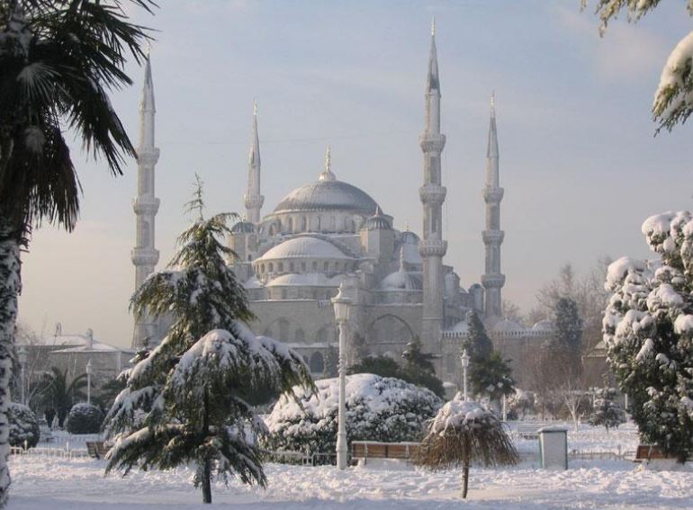 Συγκλονιστική φωτογραφία της Αγίας Σοφίας η οποία είναι καλυμμένη με χιόνι, από την ισχυρή χιονόπτωση που ξεκίνησε από χθες στην Τουρκία.