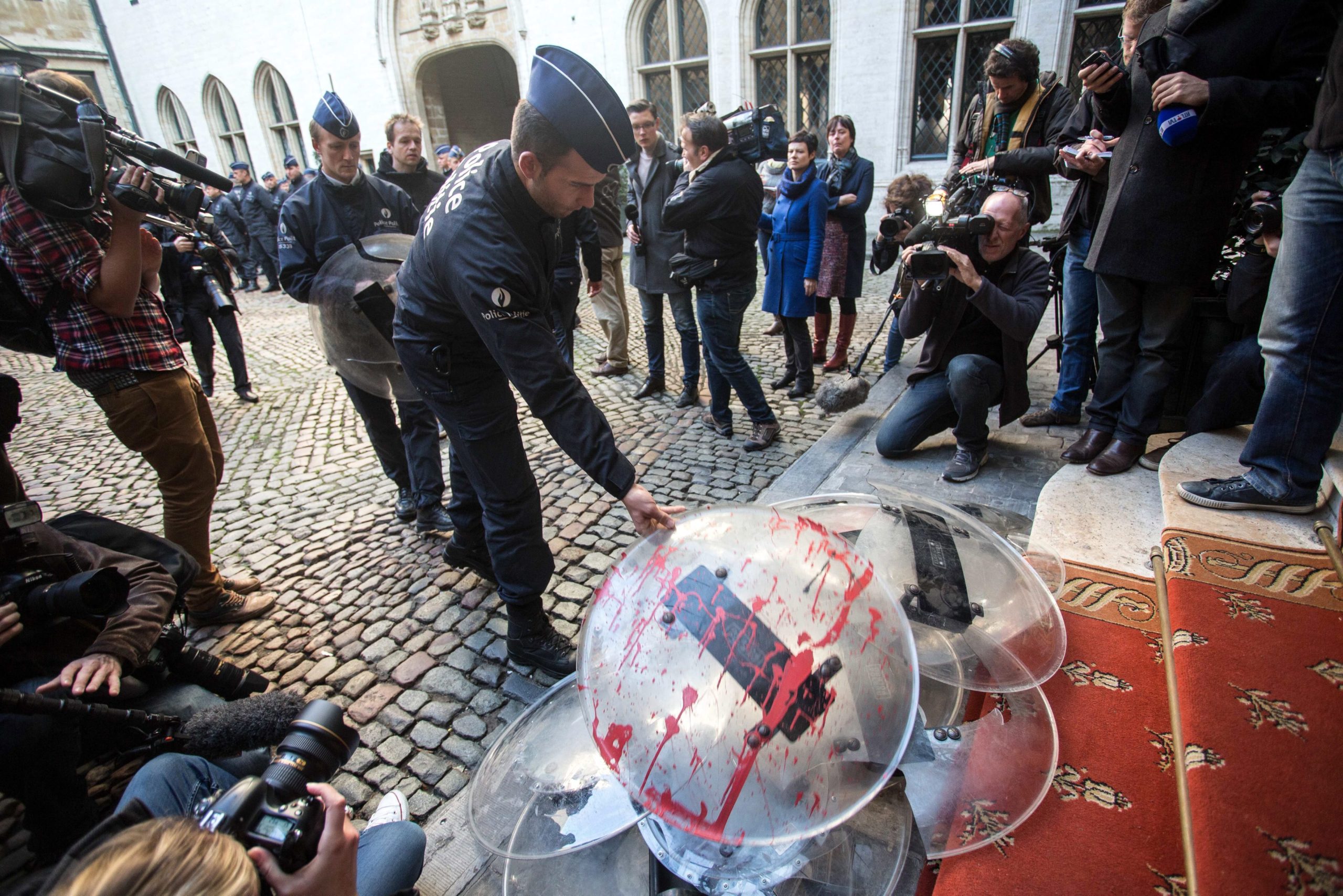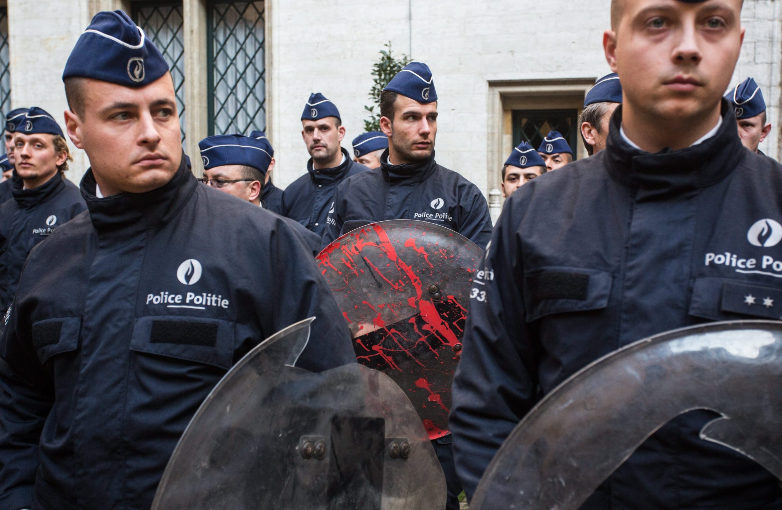 Σε μια συμβολική κίνηση, αστυνομικοί στις Βρυξέλλες κατέθεσαν σήμερα στην κεντρική πλατεία  ‘Grand Place’ έξω από το δημαρχείο, τον κατεστραμμένο τους εξοπλισμό από τις οδομαχίες της προηγούμενης εβδομάδας.