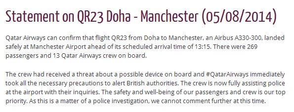 Το αεροπλάνο εκτελούσε την πτήση Ντόχα – Μάντσεστερ και σύμφωνα με την ανακοίνωση της Qatar Airways, στο Airbus A330-300 επέβαιναν 269 άτομα και 13 πλήρωμα. Τελικά το αεροπλάνο προσγειώθηκε την προγραμματισμένη ώρα δηλαδή στις 13:15 (ώρα Βρετανίας).