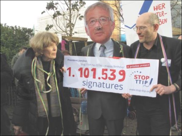 Οι πολέμιοι της συμφωνίας ελεύθερου εμπορίου μεταξύ της Ευρωπαϊκής Ένωσης και των ΗΠΑ πραγματοποίησαν μία συμβολική διαμαρτυρία σήμερα ενώπιον της Ευρωπαϊκής Επιτροπής, παραδίδοντας στον πρόεδρο της Κομισιόν Ζαν Κλοντ Γιούνκερ ένα αίτημα με περισσότερες από 1 εκατομμύριο υπογραφές, με την ευκαιρία των 60ών του γενεθλίων.