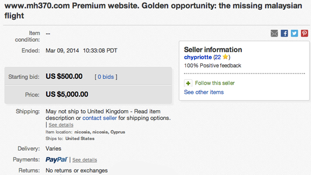Στο ebay κατέληξε το εξαφανισμένο Boeing, καθώς ένας χρήστης έβαλε πωλητήριο στο domain name με τον αριθμό της πτήσης των Μαλαισιανών αερογραμμών.