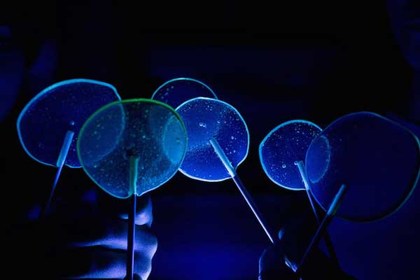 Με έδρα τη Μαδρίτη μια εταιρεία χρησιμοποιεί ζάχαρη, νερό, σιρόπι καλαμποκιού, χυμό λεμονιού και βανίλια για να δημιουργήσει ένα πρωτότυπο γλειφιτζούρι. Το νερό περιέχει μια ουσία που ονομάζεται κινίνη και η οποία παράγει έντονο μπλε χρώμα τη νύχτα. Έτσι η καραμέλα γίνεται… φωτεινή.