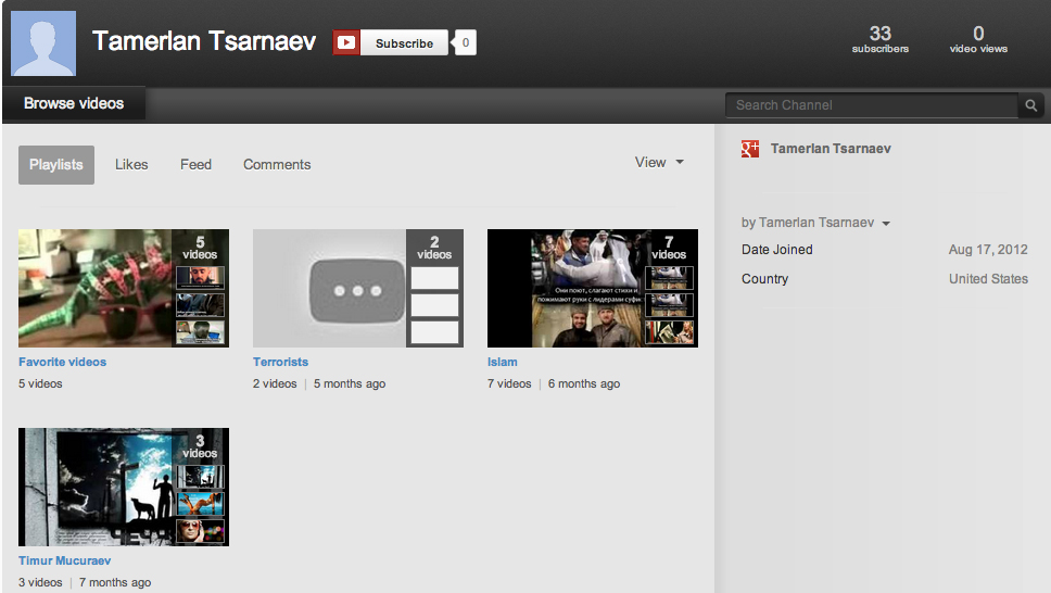 Την ώρα που όλος ο κόσμος “χτενίζει” το διαδίκτυο για να βρει πληροφορίες για τους υπόπτους της βομβιστικής επίθεσης στη Βοστώνη, ένας λογαριασμούς του youtube που ανήκει στο όνομα “Τάμερλαν Τσαρνάεφ” έκρυβε εκπλήξεις για τις αρχές.