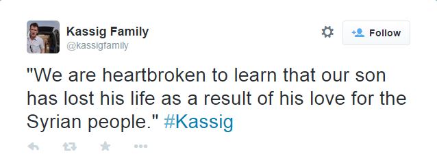 «Είμαστε συντετριμμένοι με την είδηση ότι ο γιος μας έχασε τη ζωή του λόγω της αγάπης του για το λαό της Συρίας», έγραψε ο Εντ και η Πάολα Κάσιγκ σε ένα μήνυμα που δημοσιεύτηκε στο λογαριασμό της οικογένειας στο Twitter: @kassigfamily.