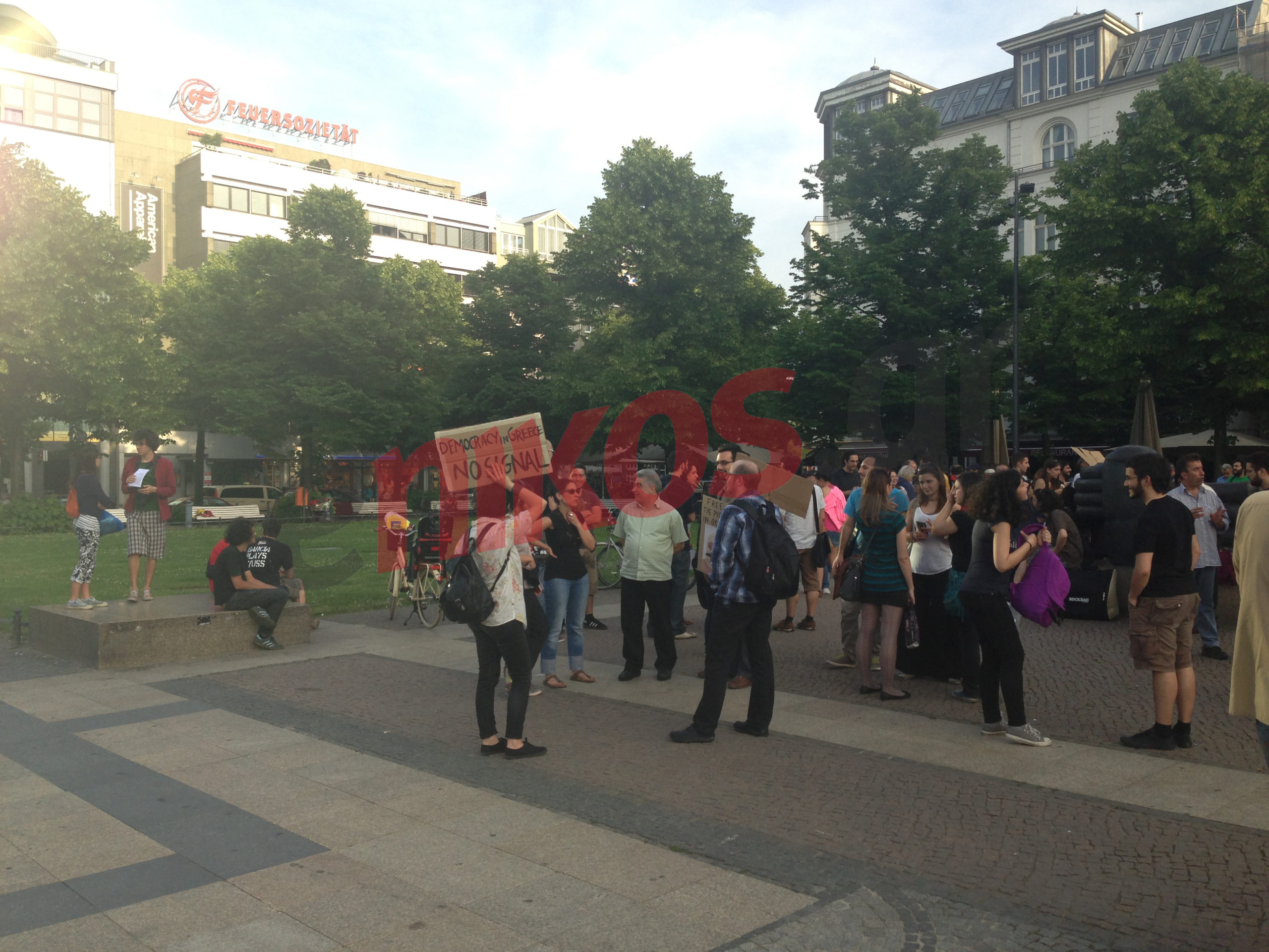 Στο Βερολίνο, έξω απο το Ελληνικό Προξενείο, οι πολίτες διαμαρτύρονται για το κλείσιμο της ΕΡΤ. Σε ένα χαρτόνι έχουν γράψει: “Η δημοκρατία στην Ελλάδα δεν έχει σήμα” και σε ένα άλλο ” Ελευθερία στον Τύπο της Ελλάδας”.