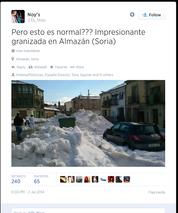 Η φωτογραφία προέρχεται από την περιοχή Αλμαζάν, 150 περίπου χιλιόμετρα βορειοανατολικά της Μαδρίτης, όπου η χαλαζόπτωση ήταν τόσο σφοδρή και διαρκής σε συνδυασμό με ισχυρό άνεμο ώστε το χαλάζι σχημάτισε βουνά στους δρόμους…