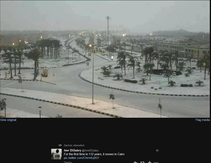 Για πρώτη φορά, μετά από 112 χρόνια χιόνισε στο Κάιρο. Όπως θα δείτε και στη φωτογραφία η πρωτεύουσα της Αιγύπτου ντύθηκε στα «άσπρα» προκαλώντας την έκπληξη των κατοίκων.
