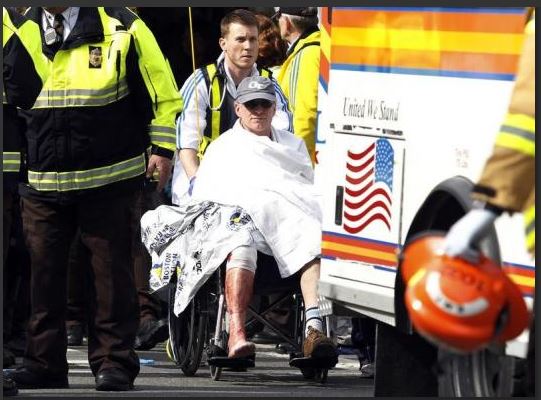 Ένας δρομέας του μαραθωνίου συνοδεύεται σε ασφαλές σημείο, μετά την έκρηξη.