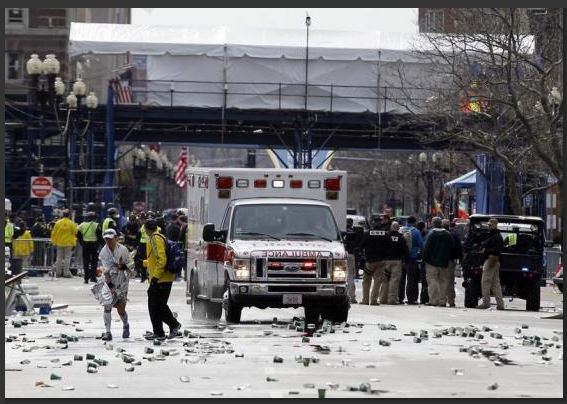 Συντρίμμια και σκόνη στο σημείο της έκρηξης στον τερματισμό του 117ου Μαραθωνίου στη Βοστώνη.