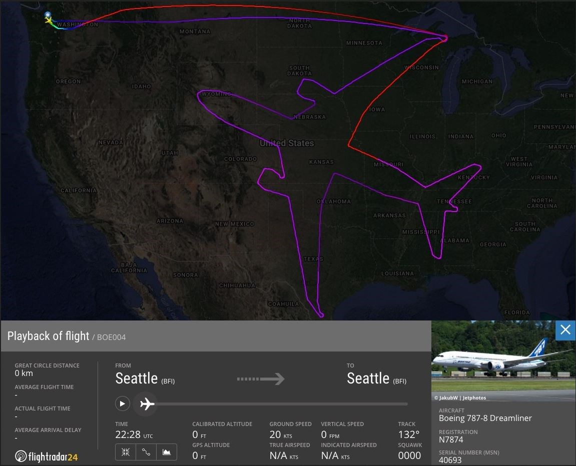 Η πτήση ξεκίνησε στο Boeing Field του Σιάτλ το απόγευμα της Τετάρτης και τελείωσε στην ίδια θέση στις 9:40 της Πέμπτης.