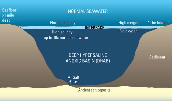 Αυτού του είδους οι υποθαλάσσιες λίμνες είναι τόσο πυκνές, ώστε τα ψάρια και τα άλλα θαλάσσια πλάσματα μπορούν μόνο να επιπλέουν στην επιφάνειά τους, όπως και οι άνθρωποι μπορούν να επιπλέουν στη Νεκρά Θάλασσα. Όταν οι ερευνητές έστειλαν υποβρύχια για να ερευνήσουν μια τέτοια πισίνα άλατος, διαπίστωσαν ότι τα υποβρύχια μπορούσαν στην πραγματικότητα να φτάσουν μόνο στην επιφάνεια της λίμνης.