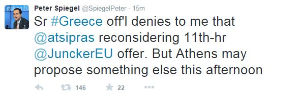 «Κυβερνητικό στέλεχος της Ελλάδας μου αρνείται ότι ο κ. Τσίπρας επανεξετάζει την πρόταση του Γιούνκερ. Αλλά η Αθήνα ίσως προτείνει κάτι άλλο το απόγευμα» έγραψε ο δημοσιογράφος των Financial Times, Πίτερ Σπίγκελ, στον λογαριασμό του στο Twitter.