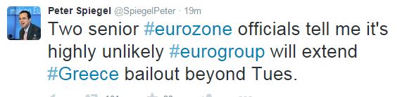 “Δύο αξιοματουχοι της ευρωζώνης μου είπαν ότι είναι ιδιαίτερα απίθανο το Eurogroup να επεκτείνει το πρόγραμμα για την Ελλάδα πέρα από την Τρίτη”, έγραψε στον προσωπικό του λογαριασμό στο twitter, ο αθρογράφος των FT, Πίτερ Σπίγκελ.