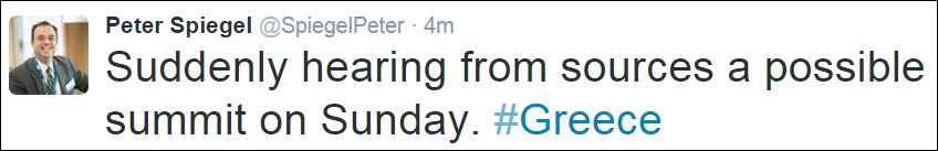 Για «πιθανή σύνοδο Κορυφής την Κυριακή» για την Ελλάδα κάνει λόγο ο δημοσιογράφος των Financial Times, Πίτερ Σπίγκελ στο twitter.
