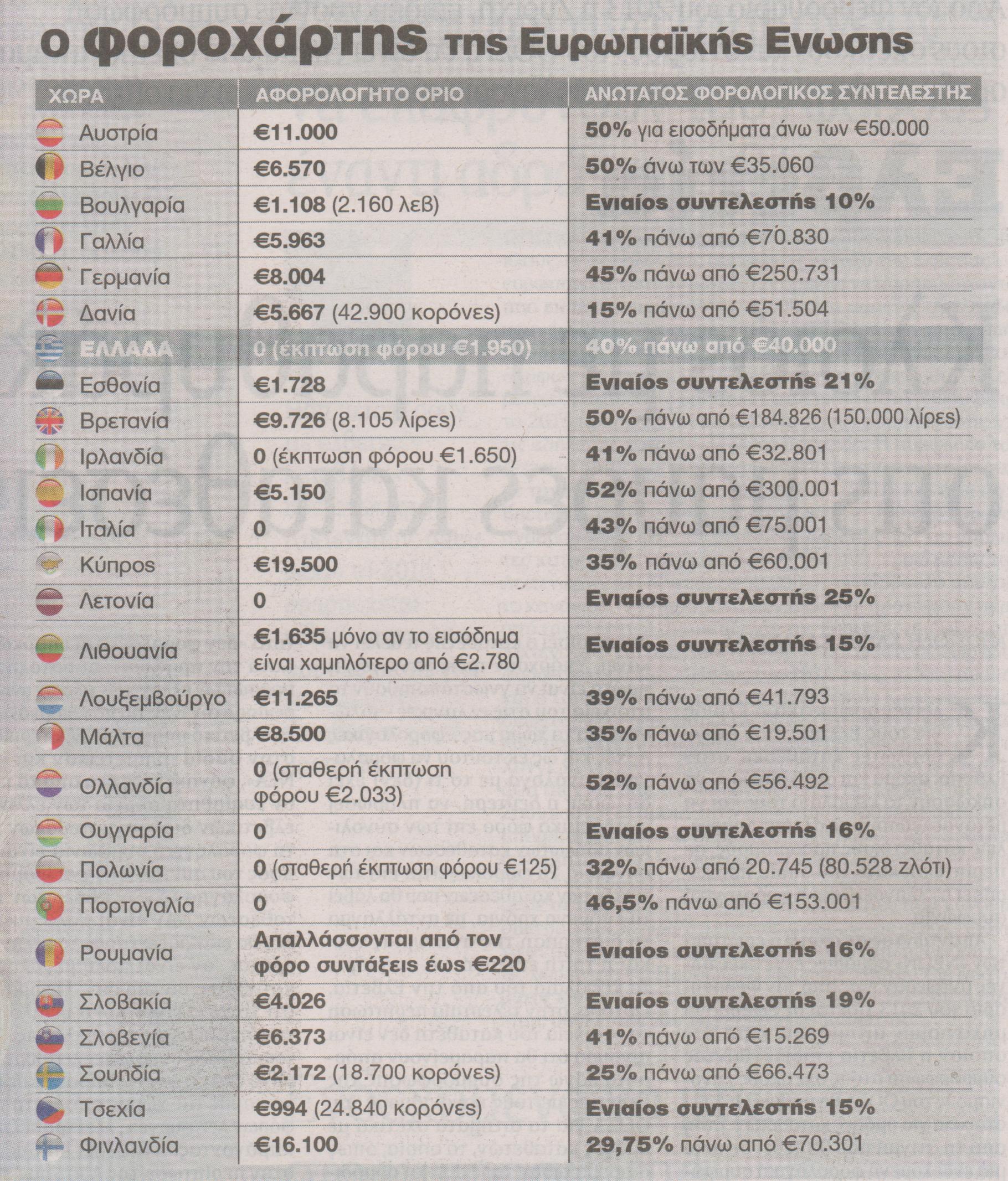 Ας κάνουμε, όμως, το φορολογικό… γύρο της Ευρώπης για να δούμε ποιοι πληρώνουν τι, στον πίνακα που παρουσιάζουν τα Νέα Σαββατοκύριακο. Πάντως, όπως αναφέρεται στην εφημερίδα, οι πολίτες ακόμα και των χωρών που φορολογούνται έως και με 52%, δεν είναι τόσο δυσαρεστημένοι όσο οι Ελληνες, διότι τα χρήματα δεν πάνε… χαμένα, αλλά τους δίνεται η δυνατότητα να απολαμβάνουν κοινωνικές παροχές που για την Ελλάδα είναι… όνειρο.