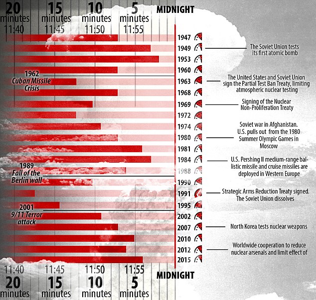 Ο λεπτοδείκτης του ρολογιού είχε μετακινηθεί για τελευταία φορά στις 10 Ιανουαρίου 2012, όταν προχώρησε κατά ένα λεπτό. Τόσο κοντά στα “μεσάνυχτα” είχε βρεθεί ξανά μόνο το 1984, όταν οι σχέσεις των ΗΠΑ με την τότε ΕΣΣΔ ήταν ιδιαίτερα τεταμένες.