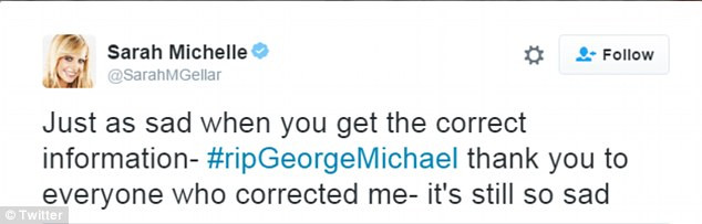 Τότε, η Σάρα Μισέλ Γκέλαρ, διόρθωσε αμέσως το λάθος της, γράφοντας σε νέα ανάρτηση: «Το ίδιο λυπηρό είναι και όταν λαμβάνεις τη σωστή πληροφόρηση. RIP George Michael. Ευχαριστώ όσους με διορθώσατε. Είμαι πραγματικά πολύ λυπημένη!»
