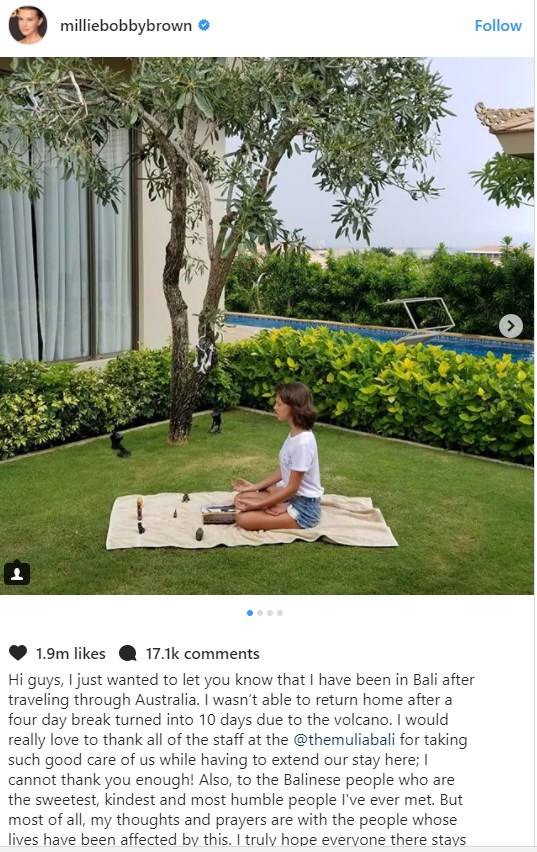 Πρόκειται για την Μίλι Μπόμπι Μπράουν, η οποία ενσαρκώνει την Eleven, στην τηλεοπτική σειρά Stranger Things. Η δεκατριάχρονη πρωταγωνίστρια αποφάσισε να κάνει ένα τετραήμερο διάλειμμα από τις υποχρεώσεις της, στο μαγευτικό Μπαλί, όμως λόγω της ηφαιστειακής σκόνης και του κλεισίματος του αεροδρομίου, αναγκάστηκε να παραμείνει στο νησί για δέκα μέρες.