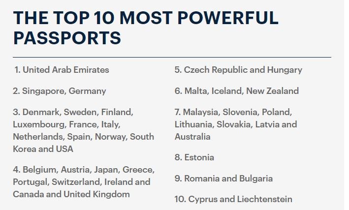 Το στοιχείο που χάρισε στα ΗΑΕ την κορυφαία θέση στη λίστα με τα “ισχυρότερα διαβατήρια” είναι ότι προστέθηκαν άλλες τέσσερις χώρες στους προορισμούς όπου κάποιος μπορεί να ταξιδέψει χωρίς βίζα από την 1η Δεκεμβρίου.