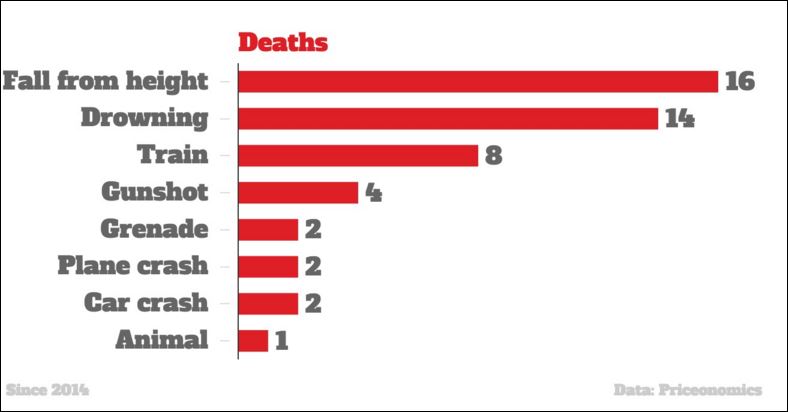Σύμφωνα με το Priceonomics, μπορεί η δημοτικότητα των selfies να έχει πέσει από το 2014, ωστόσο οι θάνατοι που σχετίζονται με τη λήψη των συγκεκριμένων φωτογραφιών έχουν αυξηθεί σημαντικά.