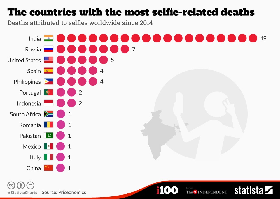 Η έρευνα της Statista αναφέρει ότι η πιο κοινή αιτία θανάτου που μπορεί να προέλθει από τις selfies ήταν η πτώση από μεγάλο ύψος, ενώ η χώρα που αποτελεί πρωταθλήτρια των δυστυχημάτων από selfies είναι η Ινδία.