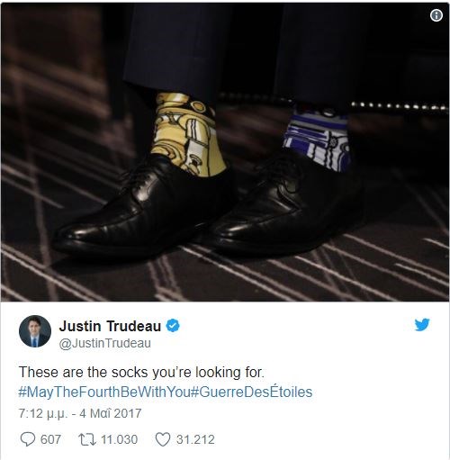 Δεν είναι η πρώτη φορά που ο Τριντό επιλέγει να φορέσει εκκεντρικές κάλτσες, καθώς στο Bloomberg Business Forum, είχε “κλέψει” όλα τα φλας των φωτογράφων. Τότε οι κάλτσες του είχαν τη μορφή ενός εκ των χαρακτήρων του Star Wars.