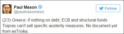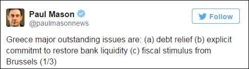 Λίγο πριν από την κρίσιμη συνάντηση του Πρωθυπουργού, Αλέξη Τσίπρα με τον Πρόεδρο της Κομισιόν, Ζαν Κλοντ Γιούνκερ και τον πρόεδρο του Eurogroup, Γερούν Ντάισελμπλουμ ο δημοσιογράφος του Channel 4, Πολ Μέισον, tweetάρει για τις «μεγάλες εκκρεμότητες της Ελλάδας» και για το τελεσίγραφο των δανειστών.