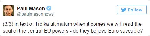 «Στο κείμενο – τελεσίγραφο της τρόικας, όταν θα έρθει στην δημοσιότητα θα διαβάσουμε την ουσία των μεγάλων δυνάμεων της ΕΕ. Πιστεύουν ότι το ευρώ μπορεί να διασωθεί;», καταλήγει ο Πολ Μέισον.