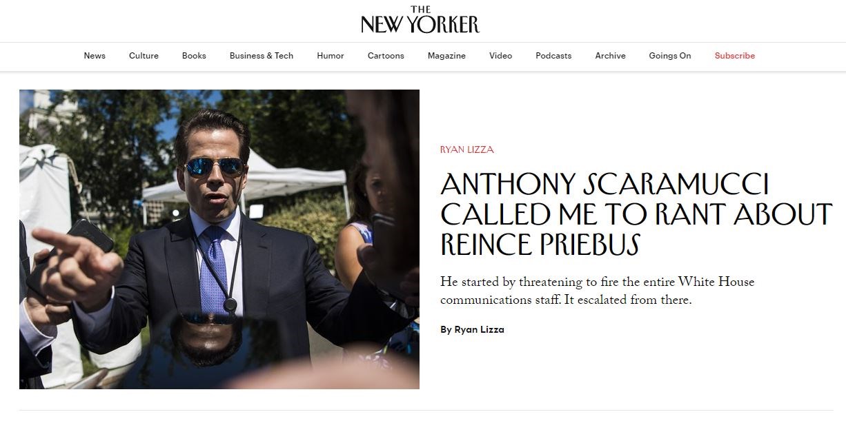 Ο Σκαραμούτσι επιτέθηκε κατά του Προσωπάρχη του Λευκού Οίκου Ράινς Πρίμπους, αλλά και του υπεύθυνου στρατηγικής του προέδρου Τραμπ, Στίβ Μπάνον, σε ένα άρθρο που δημοσιεύτηκε στην ηλεκτρονική σελίδα του περιοδικού “The New Yorker”.