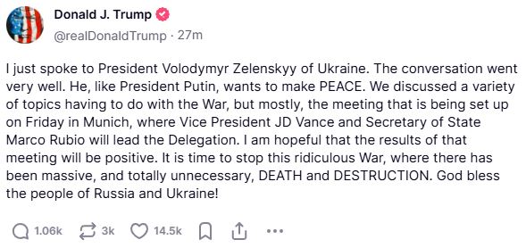Μετά την επικοινωνία του με τον Πούτιν, ο Τραμπ συνομίλησε και με τον Ουκρανό πρόεδρο, Βολοντίμιρ Ζελένσκι, επιβεβαιώνοντας ότι η συζήτηση «πήγε πολύ καλά» και πως ο Ζελένσκι επιθυμεί επίσης ειρήνη, «όπως και ο Πούτιν».