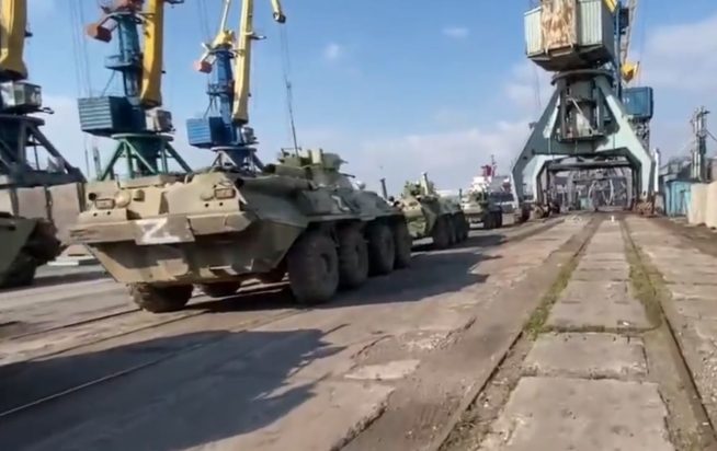 The Russian dock landing ship “Orsk”, escorted by Black Sea Fleet naval forces, entered and unloaded military equipment in the port of Berdyansk. The Ukrainian forces in Berdyansk surrendered the port without a fight, leaving the entire port infrastructure intact. pic.twitter.com/NSG1lFCd37