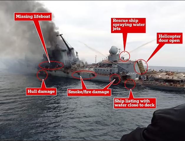 Η Ουκρανία υποστήριξε ότι έπληξε το καταδρομικό με πυραύλους κατά πλοίων επιφανείας Neptun. Η Μόσχα το διέψευσε, ανακοινώνοντας πως το πλοίο βυθίστηκε εξαιτίας πυρκαγιάς και έκρηξης μέρους του οπλισμού που έφερε στο κατάστρωμα, στις 14 Απριλίου.