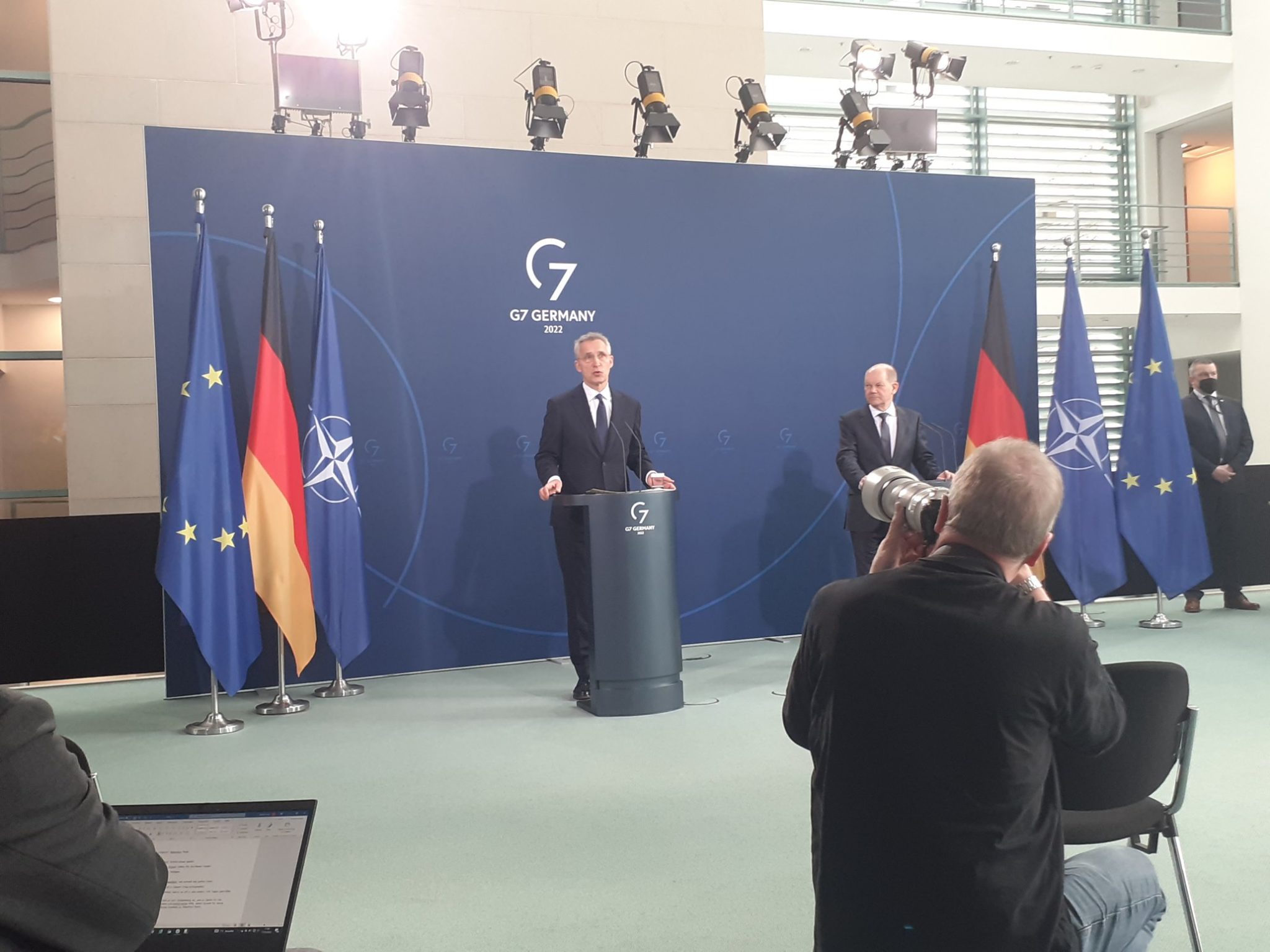 Ο Γενς Στόλτενμπεργκ διαβεβαίωσε ότι η Συμμαχία θα εξακολουθήσει να στηρίζει την Ουκρανία και ευχαρίστησε ιδιαίτερα τη Γερμανία, τόσο για την παροχή ανθρωπιστικής, οικονομικής και στρατιωτικής βοήθειας όσο και για την απόφασή της να φθάσει το 2% του ΑΕΠ της σε στρατιωτικές δαπάνες, όπως ζητά από τα μέλη του το ΝΑΤΟ. «Πρόκειται για έναν πολύ ισχυρό στόχο», ανέφερε, για να προσθέσει: «Η ηγετική σας στάση έχει μεγάλη σημασία σε αυτή τη χρονική στιγμή, η οποία είναι τόσο κρίσιμη για την ασφάλεια της Ευρώπης – και δεν μπορούμε να θεωρούμε δεδομένη πλέον την ασφάλεια. Βρισκόμαστε σε σημείο καμπής για την ασφάλεια στην Ευρώπη». Καλωσόρισε δε τις διπλωματικές προσπάθειες του Βερολίνου, ακόμη και τις απευθείας επαφές με τον ρώσο πρόεδρο, με στόχο την αποκλιμάκωση.