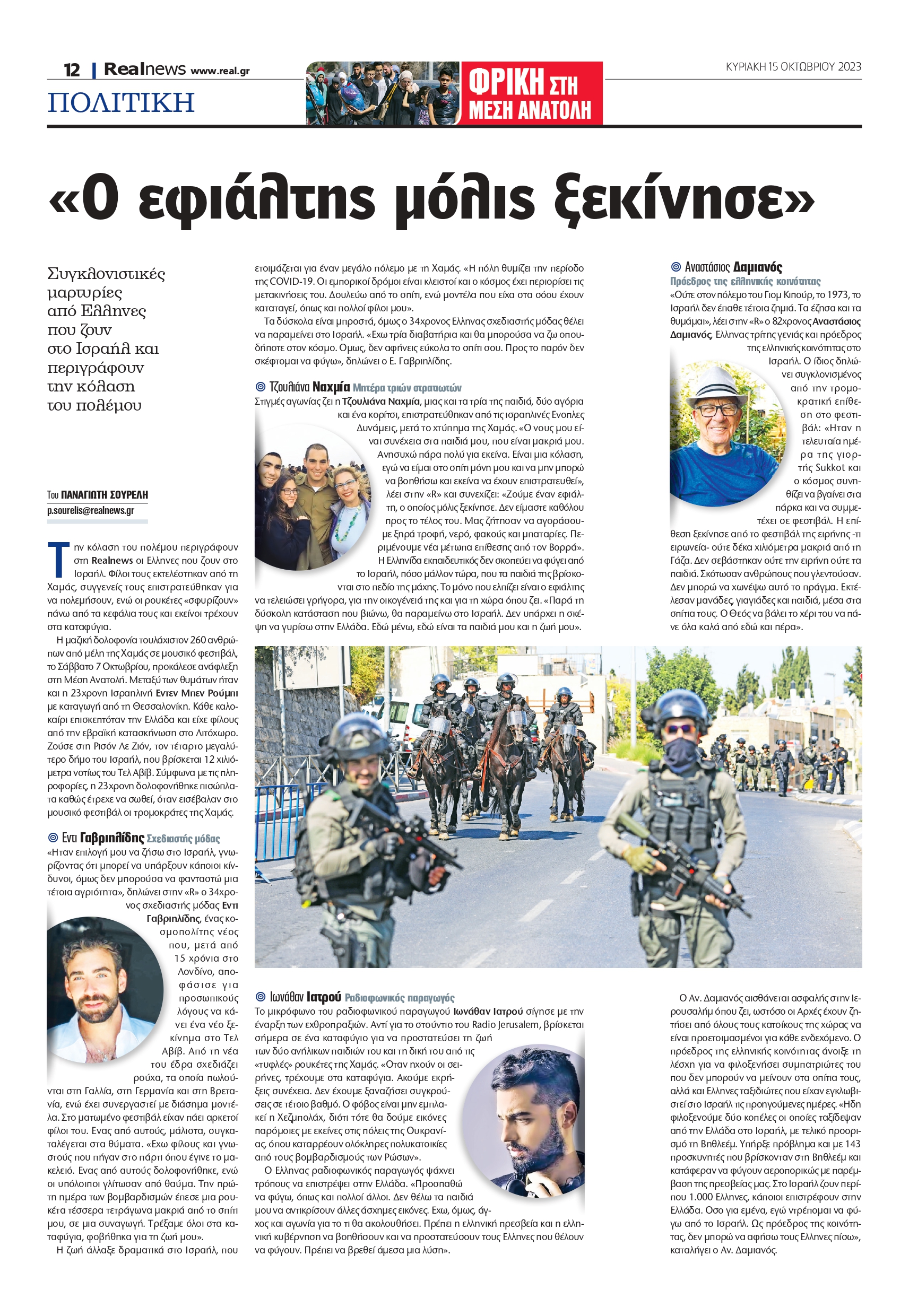 Το μικρόφωνο του ραδιοφωνικού παραγωγού Ιωνάθαν Ιατρού σίγησε με την έναρξη των εχθροπραξιών. Αντί για το στούντιο του Radio Jerusalem, βρίσκεται σήμερα σε ένα καταφύγιο για να προστατεύσει τη ζωή των δύο ανήλικων παιδιών του και τη δική του από τις «τυφλές» ρουκέτες της Χαμάς. «Οταν ηχούν οι σειρήνες, τρέχουμε στα καταφύγια. Ακούμε εκρήξεις συνέχεια. Δεν έχουμε ξαναζήσει συγκρούσεις σε τέτοιο βαθμό. Ο φόβος είναι μην εμπλακεί η Χεζμπολάχ, διότι τότε θα δούμε εικόνες παρόμοιες με εκείνες στις πόλεις της Ουκρανίας, όπου καταρρέουν ολόκληρες πολυκατοικίες από τους βομβαρδισμούς των Ρώσων». Ο Ελληνας ραδιοφωνικός παραγωγός ψάχνει τρόπους να επιστρέψει στην Ελλάδα. «Προσπαθώ να φύγω, όπως και πολλοί άλλοι. Δεν θέλω τα παιδιά μου να αντικρίσουν άλλες άσχημες εικόνες. Εχω, όμως, άγχος και αγωνία για το τι θα ακολουθήσει. Πρέπει η ελληνική πρεσβεία και η ελληνική κυβέρνηση να βοηθήσουν και να προστατεύσουν τους Ελληνες που θέλουν να φύγουν. Πρέπει να βρεθεί άμεσα μια λύση».
