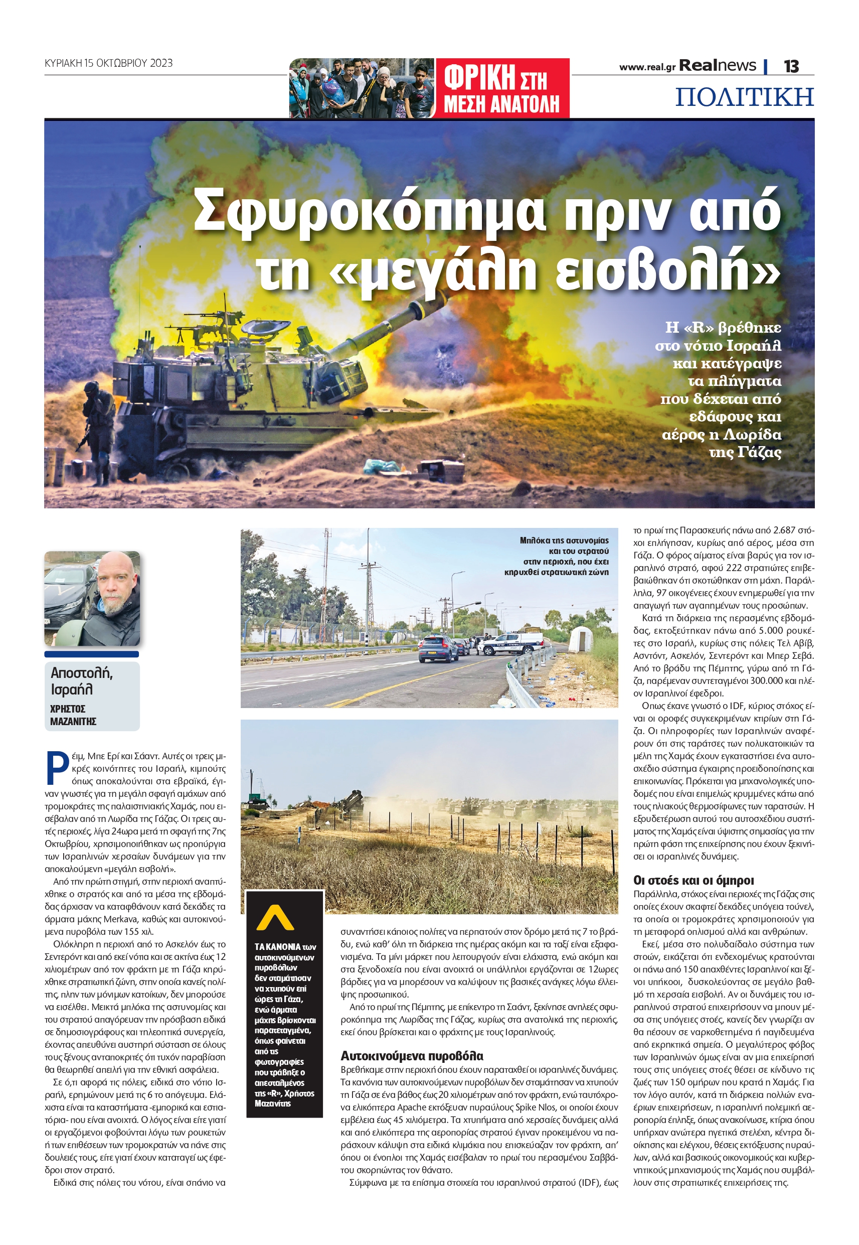 Βρεθήκαμε στην περιοχή όπου έχουν παραταχθεί οι ισραηλινές δυνάμεις. Τα κανόνια των αυτοκινούμενων πυροβόλων δεν σταμάτησαν να χτυπούν τη Γάζα σε ένα βάθος έως 20 χιλιομέτρων από τον φράχτη, ενώ ταυτόχρονα ελικόπτερα Apache εκτόξευαν πυραύλους Spike Nlos, οι οποίοι έχουν εμβέλεια έως 45 χιλιόμετρα. Τα χτυπήματα από χερσαίες δυνάμεις αλλά και από ελικόπτερα της αεροπορίας στρατού έγιναν προκειμένου να παράσχουν κάλυψη στα ειδικά κλιμάκια που επισκεύαζαν τον φράχτη, απ’ όπου οι ένοπλοι της Χαμάς εισέβαλαν το πρωί του περασμένου Σαββάτου σκορπώντας τον θάνατο. Σύμφωνα με τα επίσημα στοιχεία του ισραηλινού στρατού (IDF), έως ο πρωί της Παρασκευής πάνω από 2.687 στόχοι επλήγησαν, κυρίως από αέρος, μέσα στη Γάζα. Ο φόρος αίματος είναι βαρύς για τον ισραηλινό στρατό, αφού 222 στρατιώτες επιβεβαιώθηκαν ότι σκοτώθηκαν στη μάχη. Παράλληλα, 97 οικογένειες έχουν ενημερωθεί για την απαγωγή των αγαπημένων τους προσώπων.
